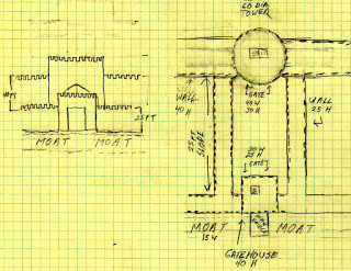 The outer gatehouse is a square 40×40 tower, 40 feet high. The inner gatehouse is a 60 foot diameter tower 60 feet high. Each tower has its compliment of guardsmen. The outer gatehouse is the residence of the deputy-commander of the guard and also spartan quarters for both a pair of mages and a pair of acolytes.