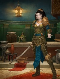 [edit | edit source]Drelnza had raven tresses and ruby-red lips. She was completely armored in gold-chased full plate, her helmet's plume as black as her hair. She carried Heretic, a magical bastard sword (described as a wakizashi in the third edition version).