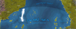 The Pearl Sea is the name for the body of water south of the Densac Gulf. "According to various old maps, [it] is loosely defined by island chains inhabited by pirates, south of which is the so-called Pearl Sea."[1] In the southeastern waters off the Amedio coast it is called the Vohoun Ocean. Where the sea meets the west coast of Hepmonaland, it is instead known as the Vogan Sea.