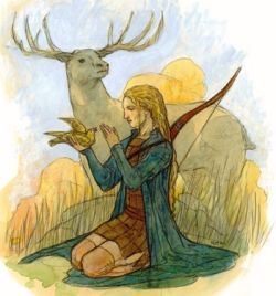 [edit | edit source]The first known swanmay, Fionnghuala, was a mortal human ranger who was rewarded for sacrificing her life to save an avatar of Oberon by being raised from the dead, made a demigoddess by Titania, and gifted with a white feather token that enabled her to take the form of a swan. Over the centuries since, a small, secret sorority of female rangers have been granted simulacra of Fionnghuala's feather, allowing them to also become swanmays.