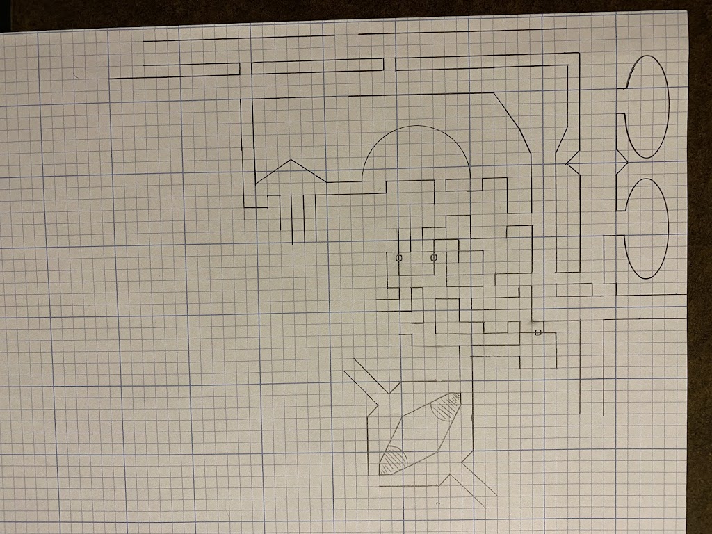 3. We ran timed, 10-minute design sprints, drawing and mapping the dungeon environment. After 10 minutes, we pivoted the map to work on the area the other had just been building. The two 10-minute “turns” complete one sprint.