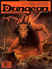 [edit | edit source]Dungeon (initially titled Dungeon Adventures) first received mention in the editor's column of Dragon Issue 107 (March 1986). Lacking a title at that point, it was described as "a new magazine filled entirely with adventures" made available "by subscription only" that would debut "in the late summer or early fall" of 1986 and "come out once every two months".[5]