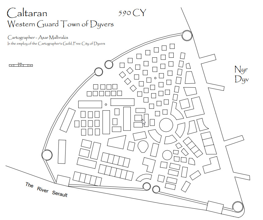 [edit | edit source]A sketch of the town of Caltaran, produced for the Living Greyhawk campaign for the free city of Dyvers region.