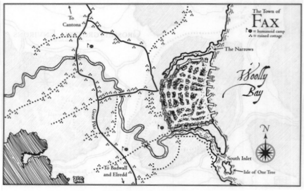 The Wild Coast settlement, Fax, illustrated in The Adventure Begins (1998). Art by Sam Wood.