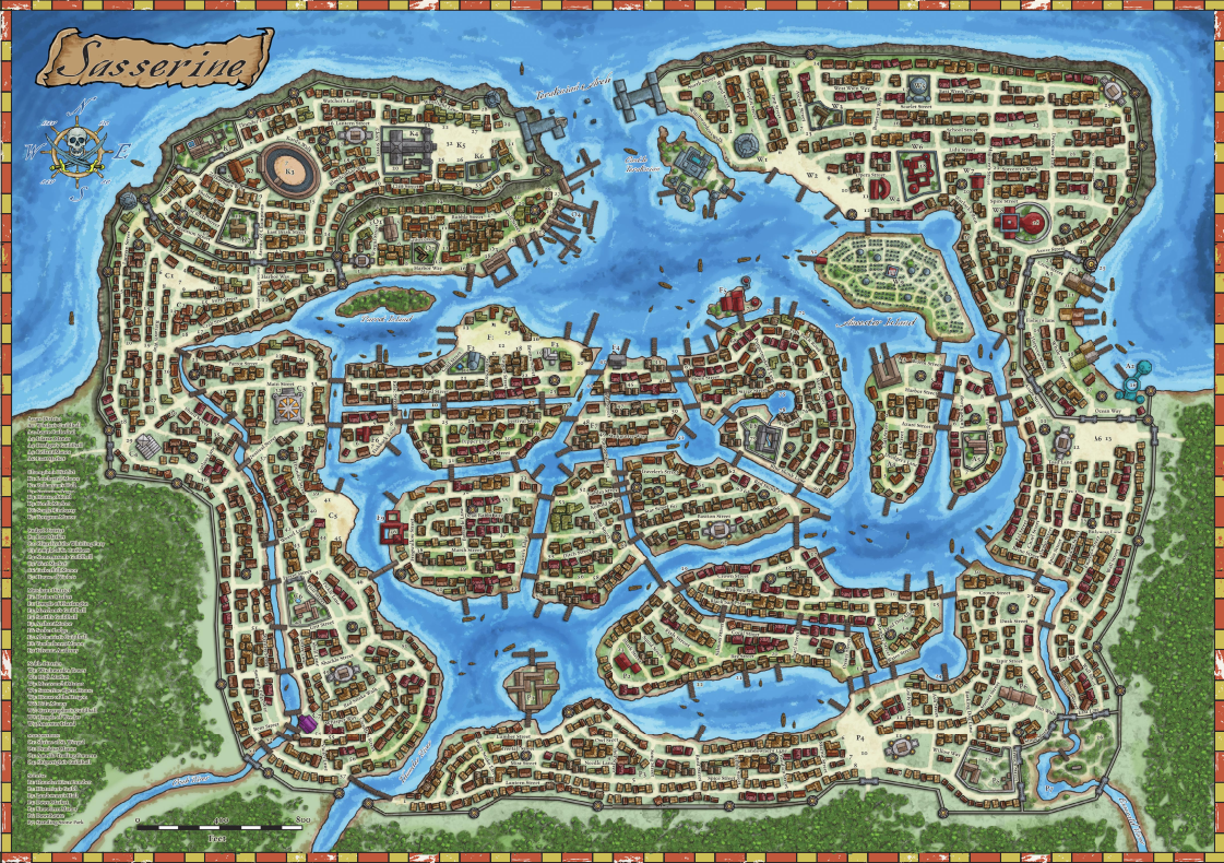 [edit | edit source]Sasserine map, Savage Tide Player's Guide, 2006, cartography by Robert Lazzaretti—FAIR USE: No other image available, low resolution, image relates to subject of academic discussion.